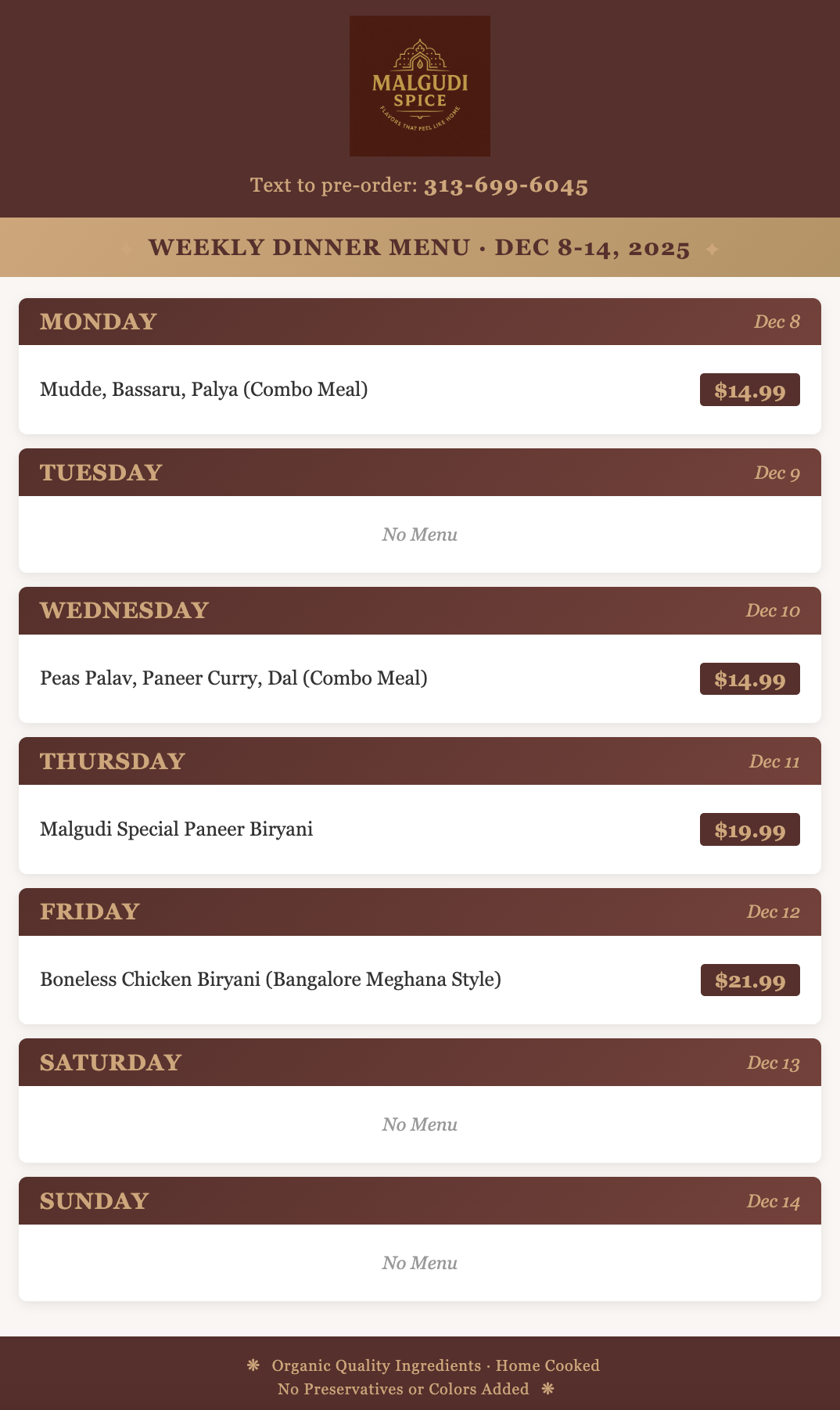 At Malgudi Spice, we specialize in traditional Karnataka and South Indian cuisine, prepared with love using time-honored recipes. Every dish is crafted from organic ingredients, made fresh daily without any preservatives or artificial additives. We believe in the purity of homemade cooking that brings comfort and nostalgia with every bite.